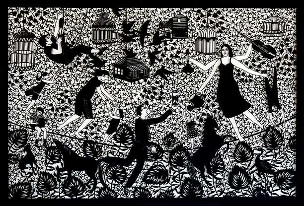 I draw with a knife and paint with thread, cutting and sewing paper to tell visual stories. My work is based on the idea that everything is connected. Starting with a single sheet of paper, I cut out shapes to contour the story around a central character or intention. Figures, botanical motifs, symbolic elements and words form the connections within and beyond the piece. The intricacy of the connections is essential for the piece to hang together.